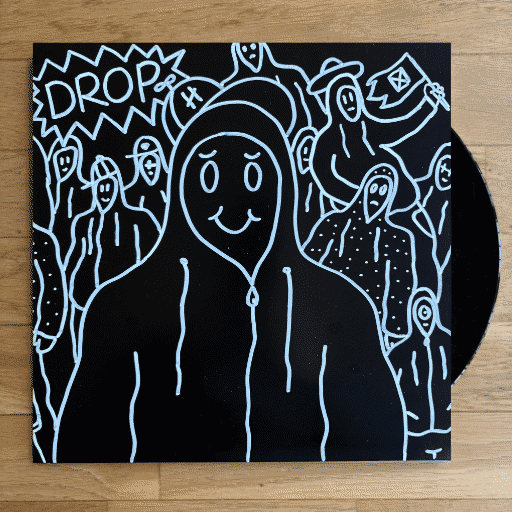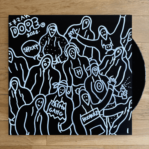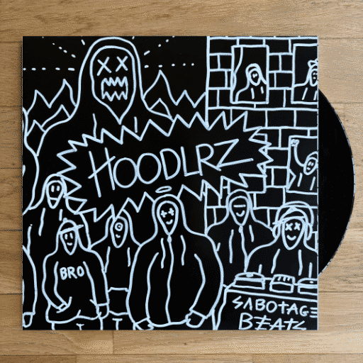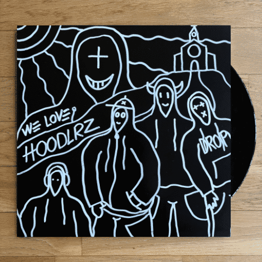 25 exclusive hand-crafted vinyl artworks across three editions: Black (10), White (5), and Craft (10). Each piece features a unique hand-drawn sleeve and a custom pressed disc — choose your 4 tracks from the Hoodlrz catalog and arrange them on Side A & Side B.